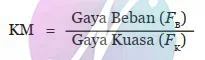 Keuntungan mekanis (KM) adalah bilangan yang menunjukkan berapa kali pesawat sederhana menggandakan gaya. Dapatkah kamu menghitungnya? Caranya dengan menghitung besar perbandingan gaya beban dengan gaya kuasa yang diberikan pada benda. Berikut adalah persamaan matematisnya:
